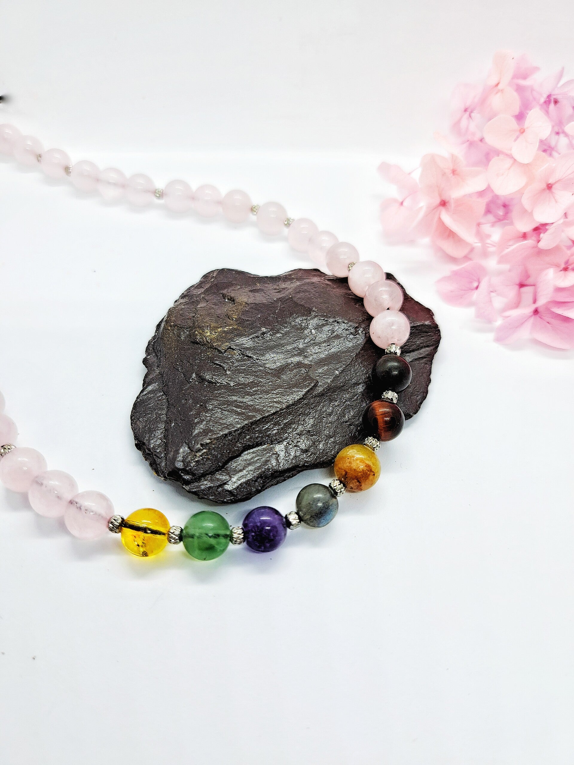 Exquisite handmade rose quartz 8mm beads necklace, with the 7 chakra natural gemstones; citrine for Crown Chakra, fluorite for Third Eye Chakra, amethyst for Throat Chakra, labradorite for Heart Chakra, rutilated quartz for Solar Plexus Chakra, red tiger eye for Sacrum Chakra, and bloodstone for Base Chakra.