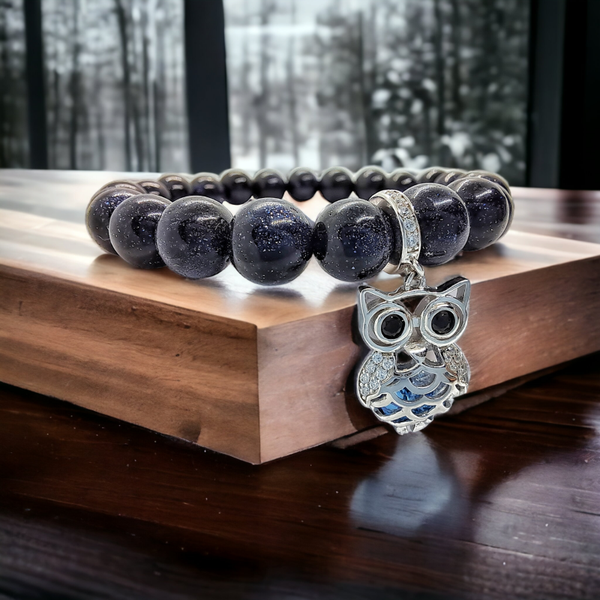 Mesmerising 8mm blue sandstone beads bracelet, handmade on stretchy jewellery cord, in regular size 18cm, will comfortably fit wrist between 17-19cm. Finished with adorable sterling silver and gradient blue crystals owl charm.