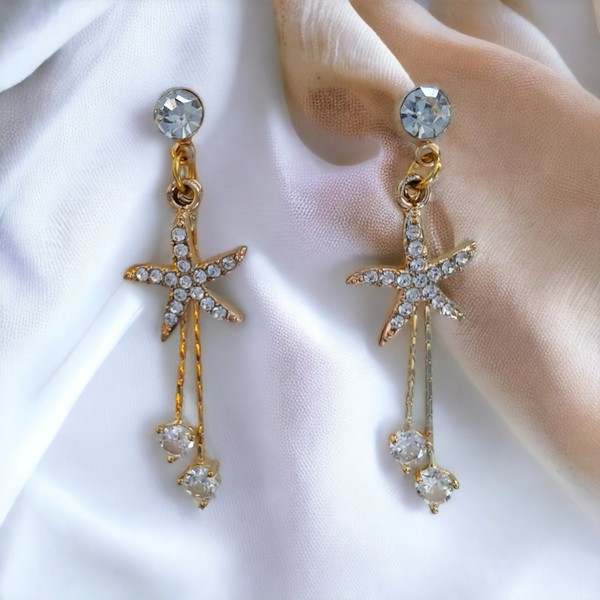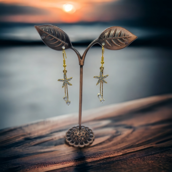 Beautiful dangly earrings, captivating the very essence of summer. Gorgeously sparkly starfish charm, combined with delicate two strand tassel in either silver or gold plated settings. Available in choice of two ear fittings: on stainless steel silver or gold plated studs, or on sterling silver/gold plated ear wires. Approximately 5cm long.
