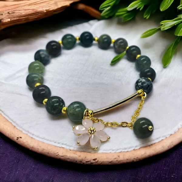 Classy and elegant bracelet, lovingly handcrafter using 8mm moss agate beads with gold plated findings, on stretchy jewellery cord in regular size 18cm. It'll comfortably fit wrist between 17-19cm.