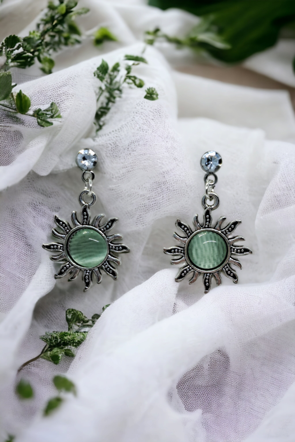 Absolutely mesmerising handmade drop earrings, with gorgeous sun charm, paved with genuine cat's eye quartz crystal. Now with the choice of ear fitting - sterling silver hooks with approximately 4cm drop, or stainless steel crystal studs with approximately 3cm drop.