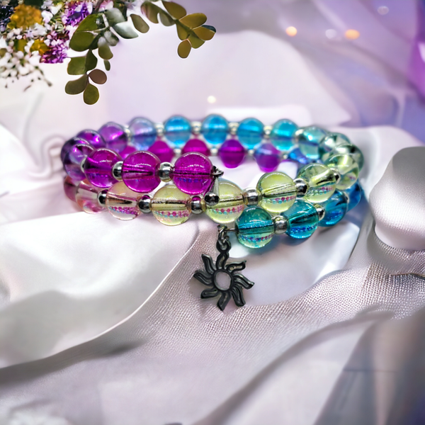 Beautiful layered bracelet made of acrylic rainbow beads on memory wire. Very easy to put on, simply wrap around your wrist - no fiddly clasps. Finished with stainless steel charms featuring sun and rain drop. Size M/L will best fit wrist between 18-21 cm. Please note that this bracelet is not suitable for very slim wrist under 17cm diameter.