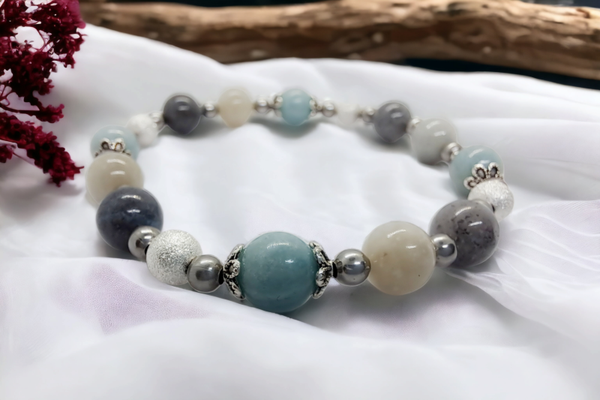 Gorgeous handmade trolleite bracelet, lovingly handcrafted using highest quality natural 8mm beads with stainless steel 4mm ball beads, 6mm silver plated dusted beads, and antique silver flower caps. Made on strong elastic jewellery cord in regular size 18cm will comfortably fit wrist between 17-19cm.