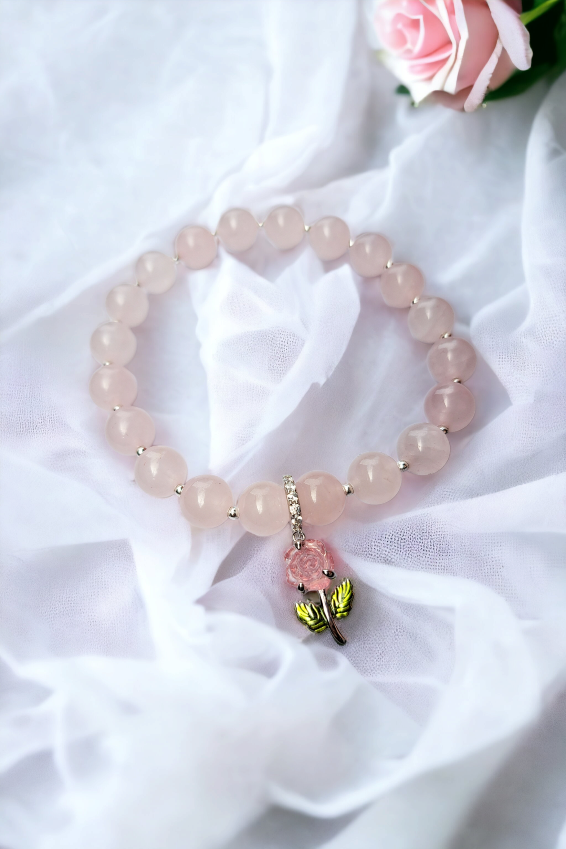 Crafted with special attention to detail, our exquisite rose quartz 8mm beads bracelet with sterling silver charm is sure to add flair and a romantic touch to any outfit.