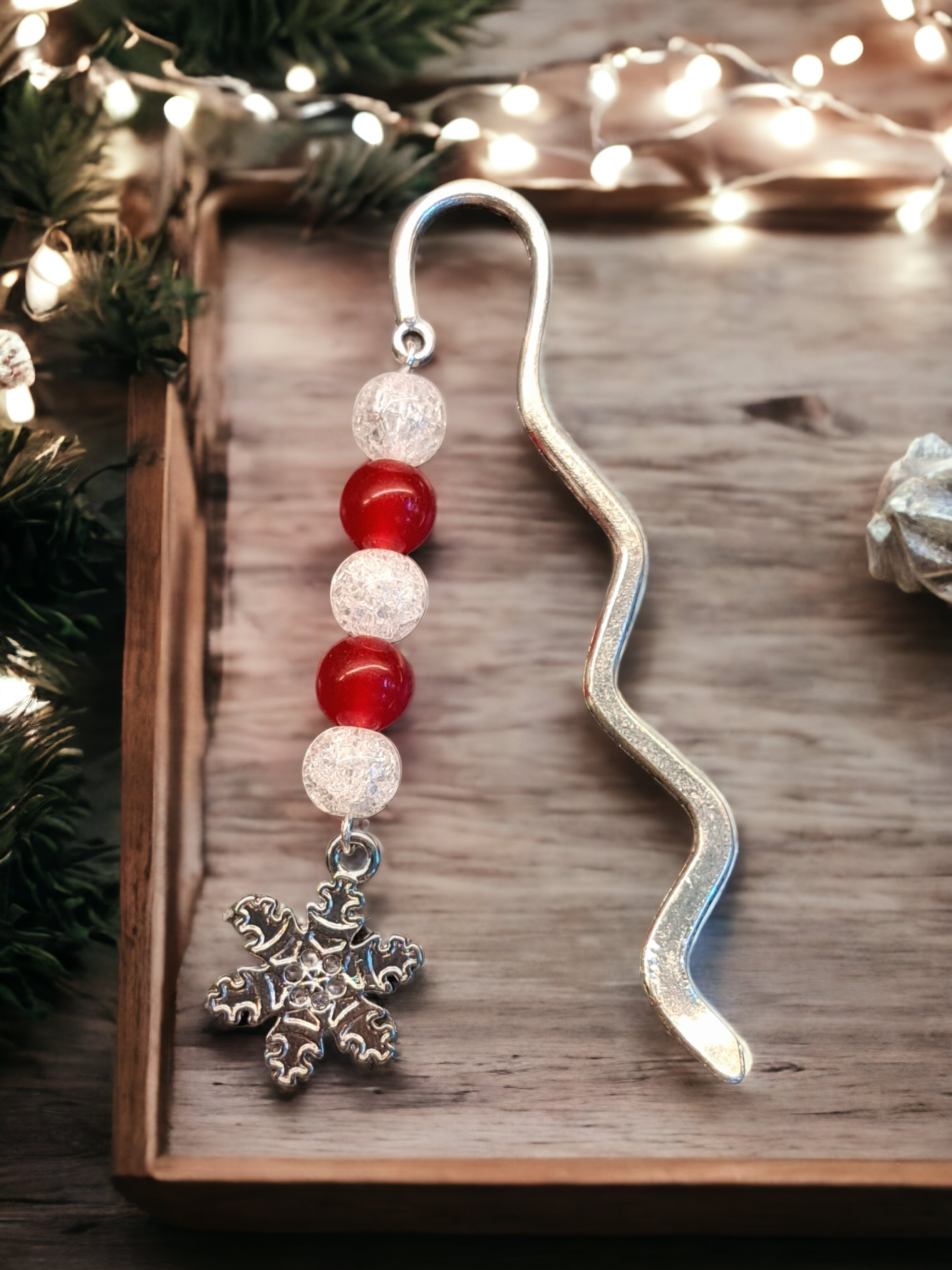 This simple bookmark adds a touch of elegance to your favorite novel - crafted from crackled crystal quartz and red jade beading with silver snowflake charm.