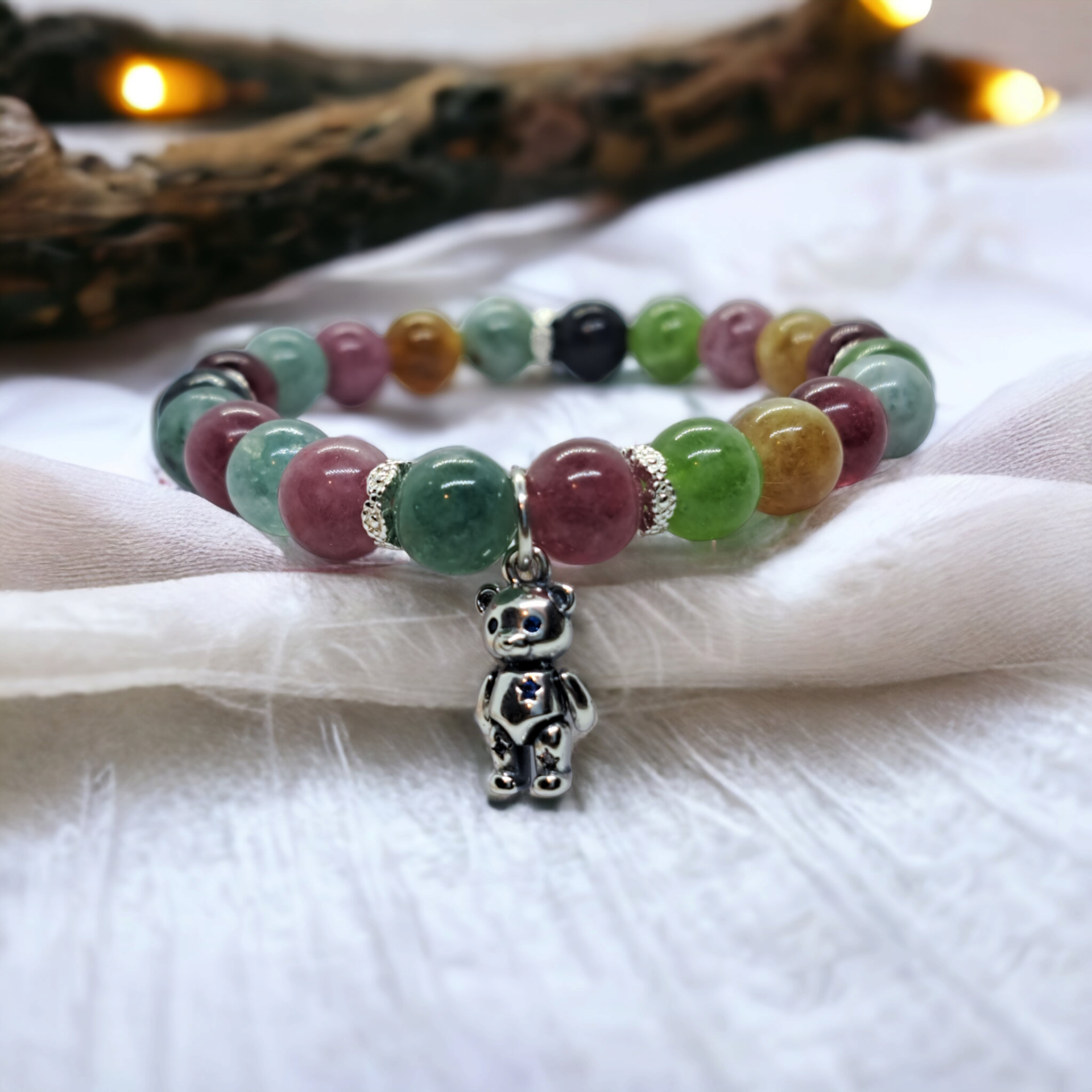 Handmade rainbow tourmaline 8mm beads bracelet with sterling silver bear charm