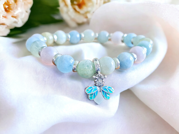 Embrace minimalistic style and delicate pastel colours with this elegant 8mm morganite beads bracelet, featuring a highly detailed sterling silver, glow in the dark moth charm.
