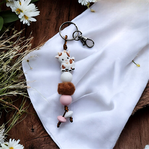 Absolutely adorable baby goat charm keyrings. Made on silk cord, with food graded 15mm silicone beads and fluffy pompom beads, on stainless steel snap on flower clasp. Approximately 14 cm (5.5 inches) long from the top of the clasp.