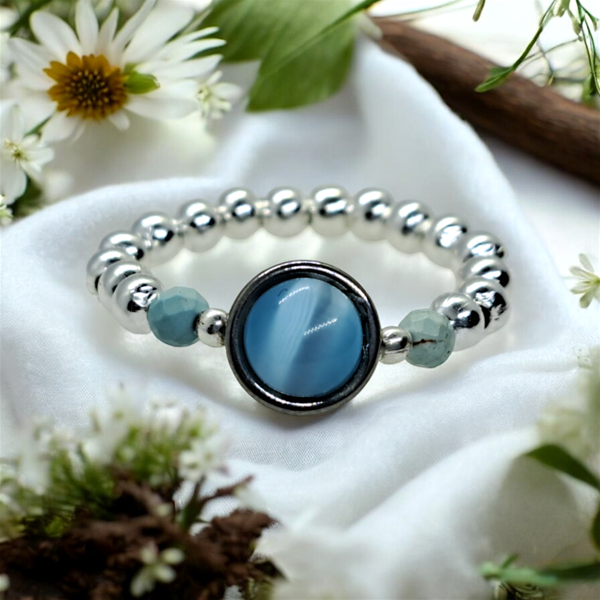 Elastic beaded ring with blue cats eye centerpiece