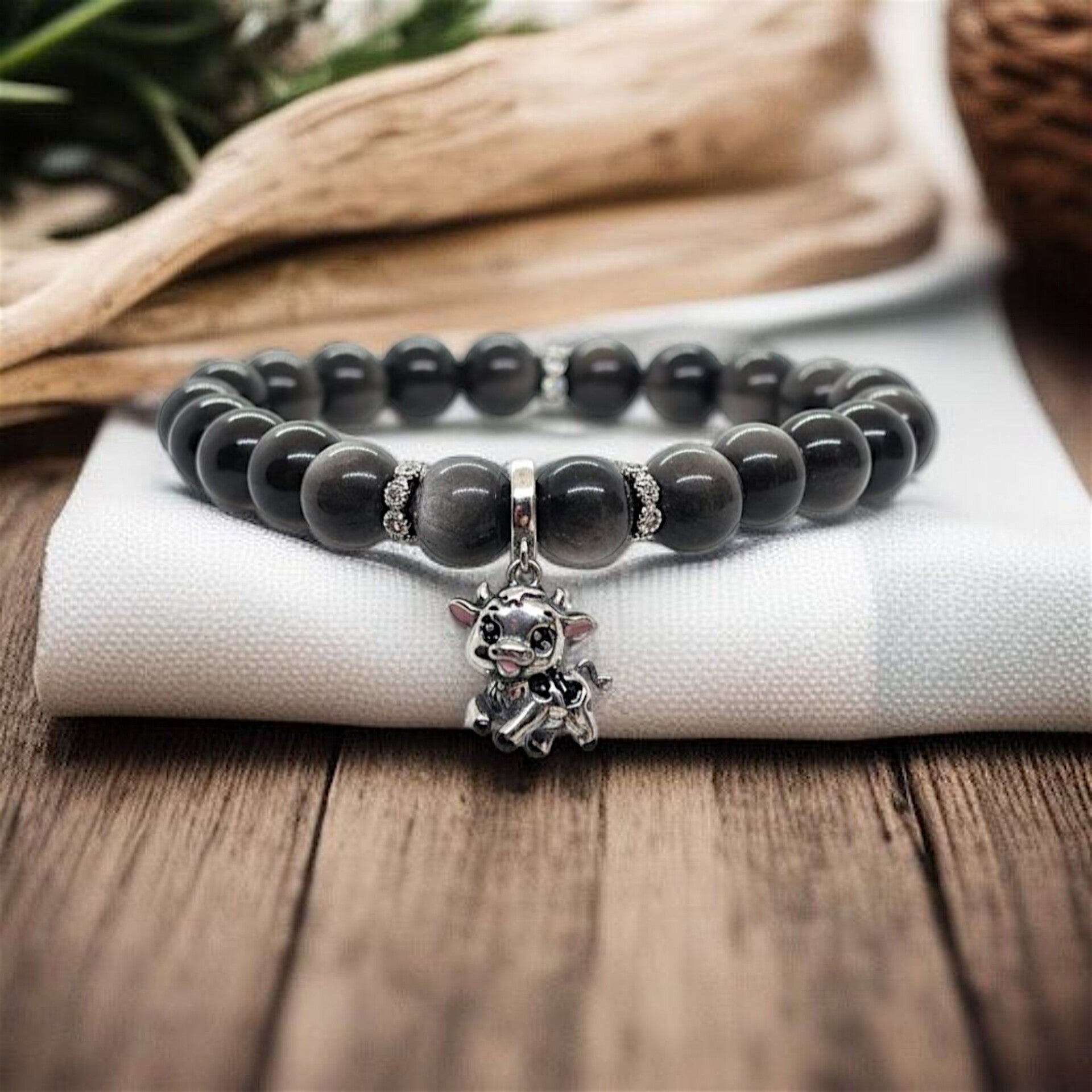 Handmade silver sheen obsidian 8mm beads bracelet with sterling silver cow charm