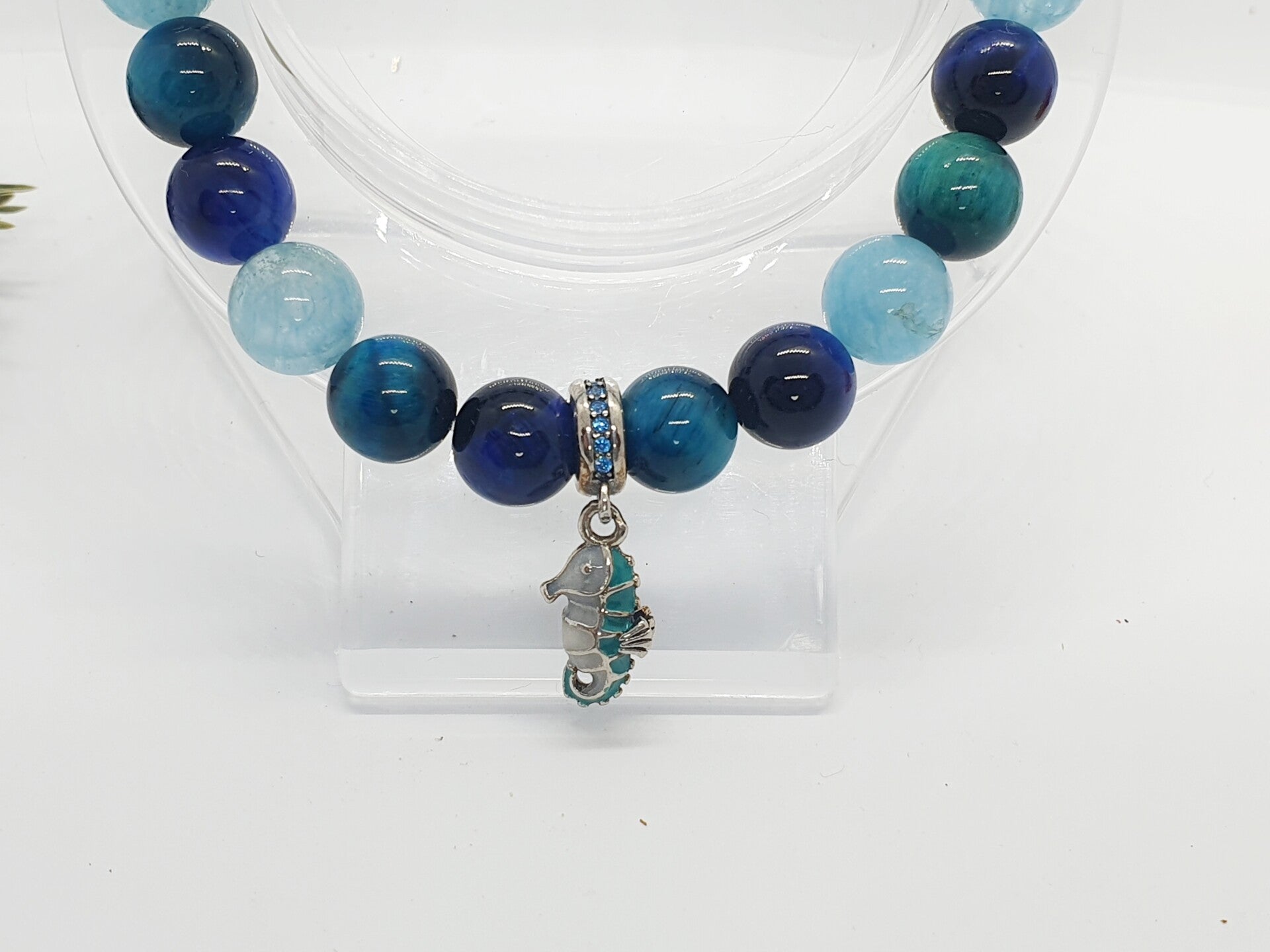 Marine style 8mm beads bracelet, made of high quality aquamarine, apatite and blue tiger's eye beads, on strong, elastic jewellery cord in regular size 18cm. Finished with adorable, sterling silver seahorse charm.