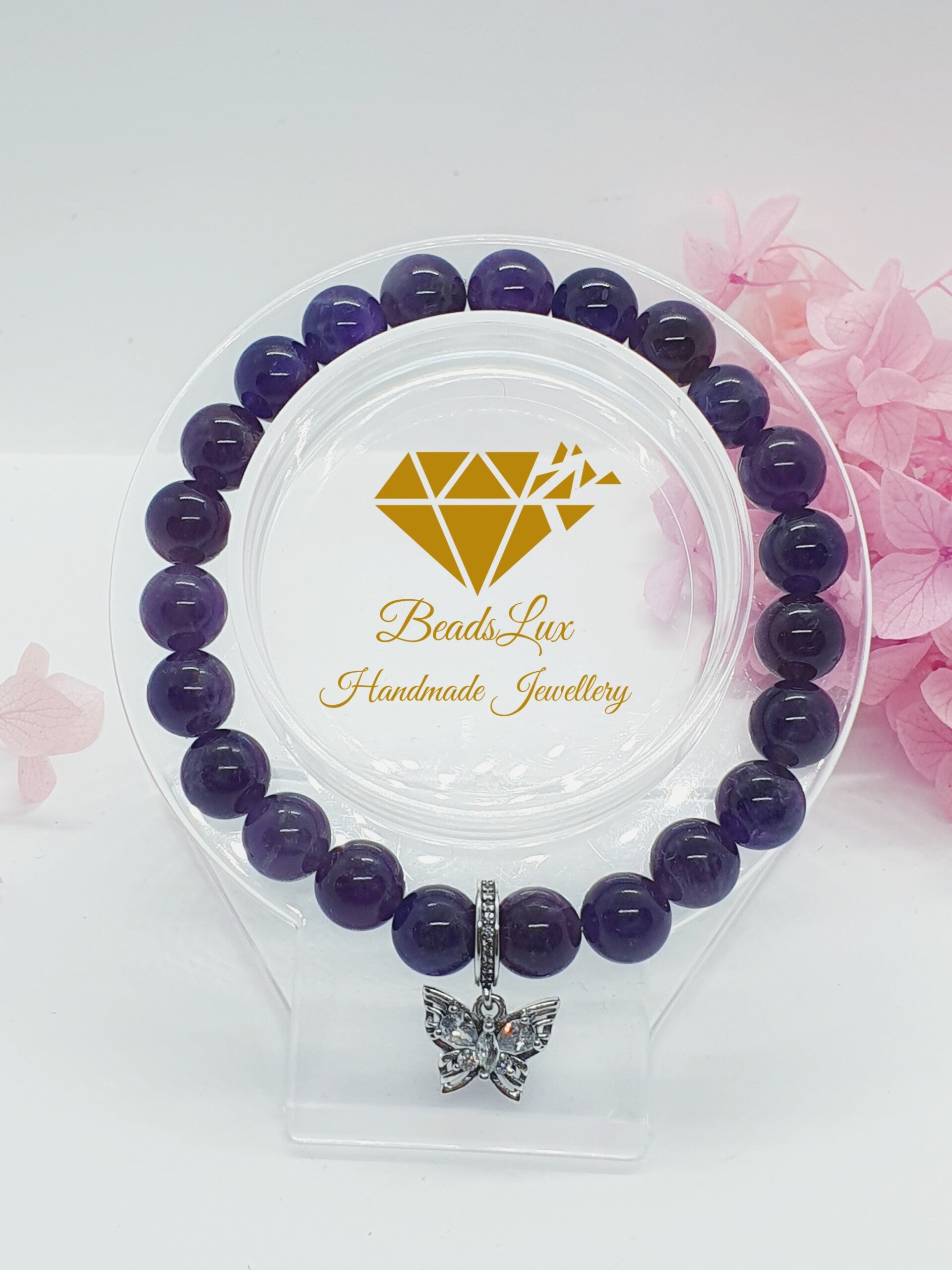Gorgeous stretchy beads bracelet made of 8mm amethyst beads in regular size 18cm will comfortably fit wrist between 17-19cm. Finished with stunning sterling silver butterfly charm paved with cubic zirconia.