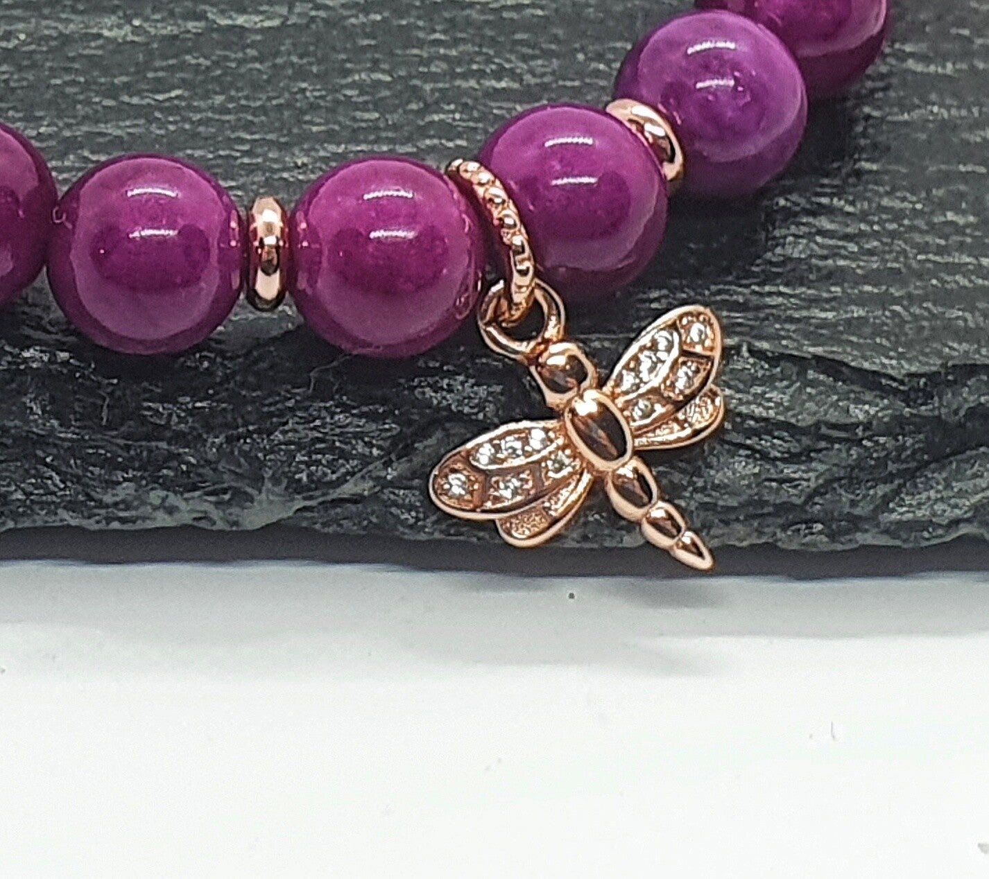 Bright and vivid fuchsia jade, 8mm stretchy beads bracelet, made on strong jewellery cord in regular size 18cm, will comfortably fit wrist between 17-19cm. Finished with sterling silver dragonfly charm, plated with rose gold, and two tiny rondelle spacer beads made of stainless steel plated with rose gold.