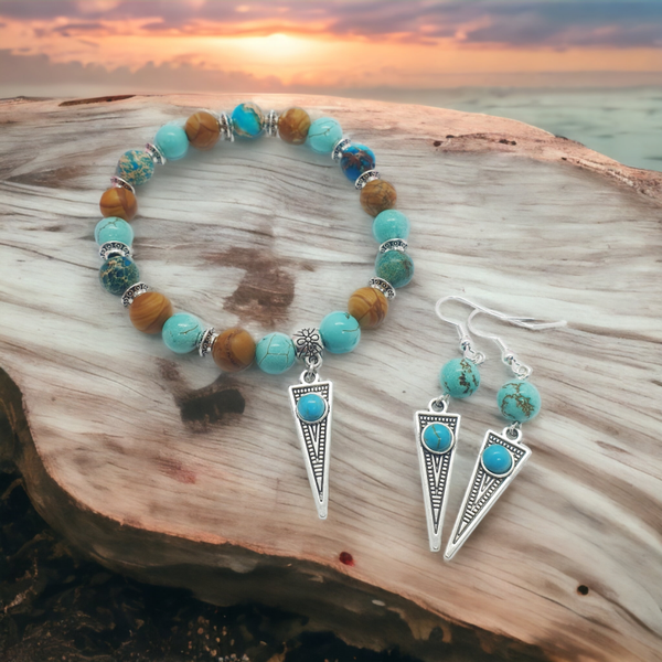 Unique and original, boho style handmade beads bracelet made of 8mm turquoise and yellow wood jasper, with antique silver spacer beads. Made on stretchy jewellery cord, in regular size 18cm, finished with antique silver charm with synthetic turquoise stone.